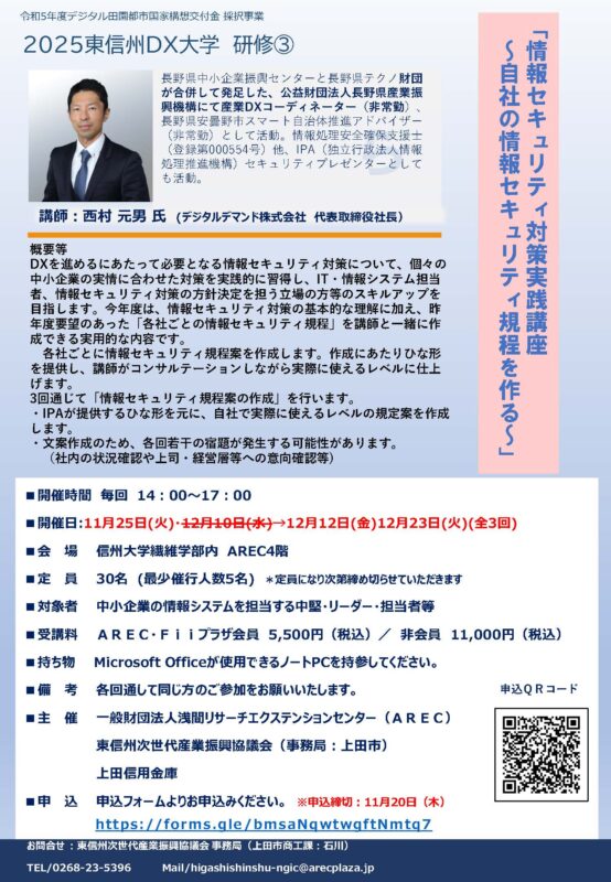 11/25|東信州DX大学2025③ 情報セキュリティ対策実践講座 ~自社の情報セキュリティ規程を作る~ のご案内
